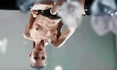 Fake Hostel - Slim blonde babe trussed up and fucked by Futa MILF rod in bidy stocking with oral and pussy creampie climax