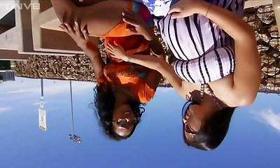 Red-haired Abigaiil Morris is having some naughty fun in the sun shaking her big hooters and ass by the pool, curvy dark haired Sammy Tor
